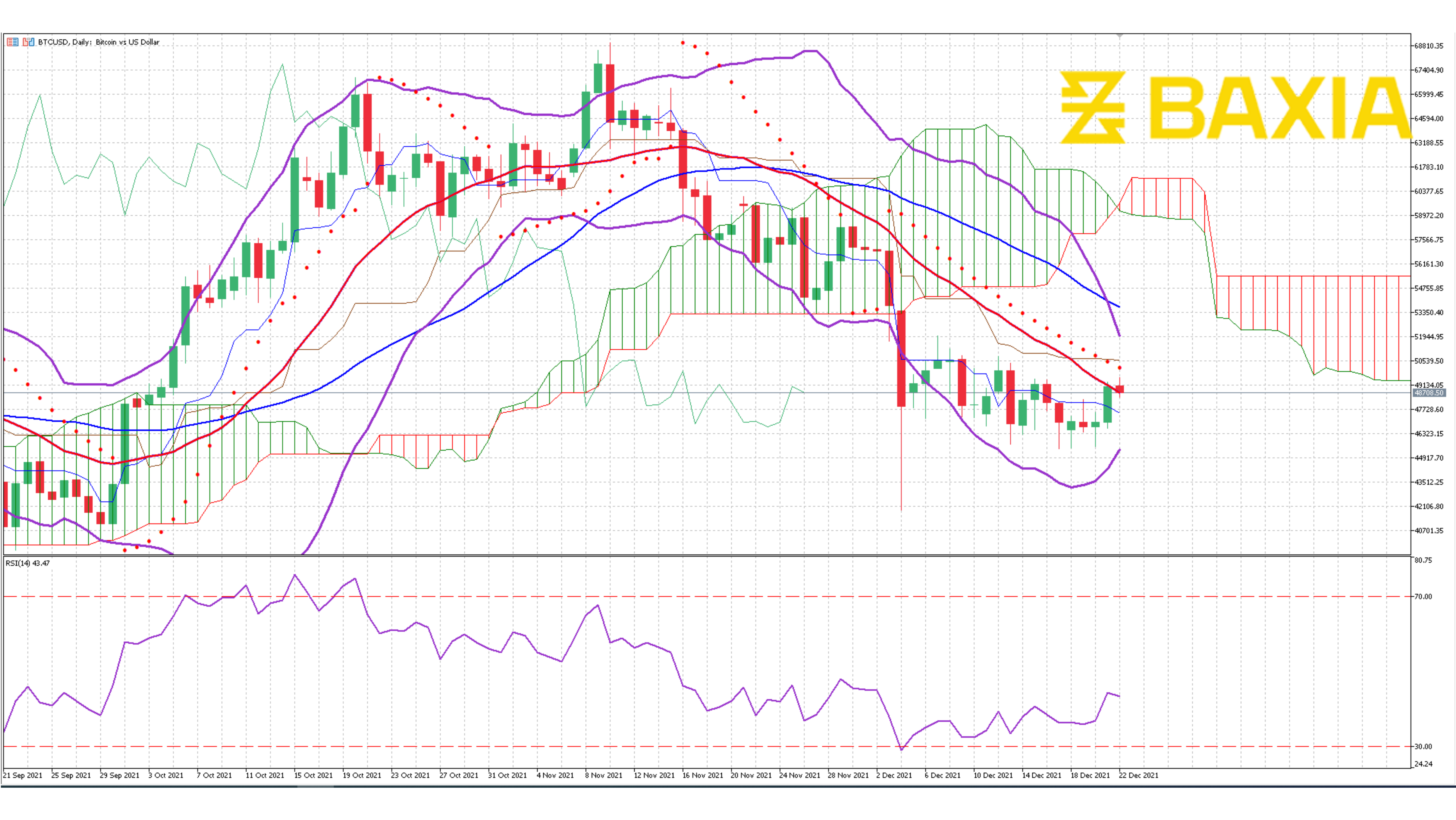 The relative strength index is at 57% which will allow Bitcoin to start an uptrend once the consolidation period is over. Our parabolic SAR indicator suggests that the price will start an uptrend soon.