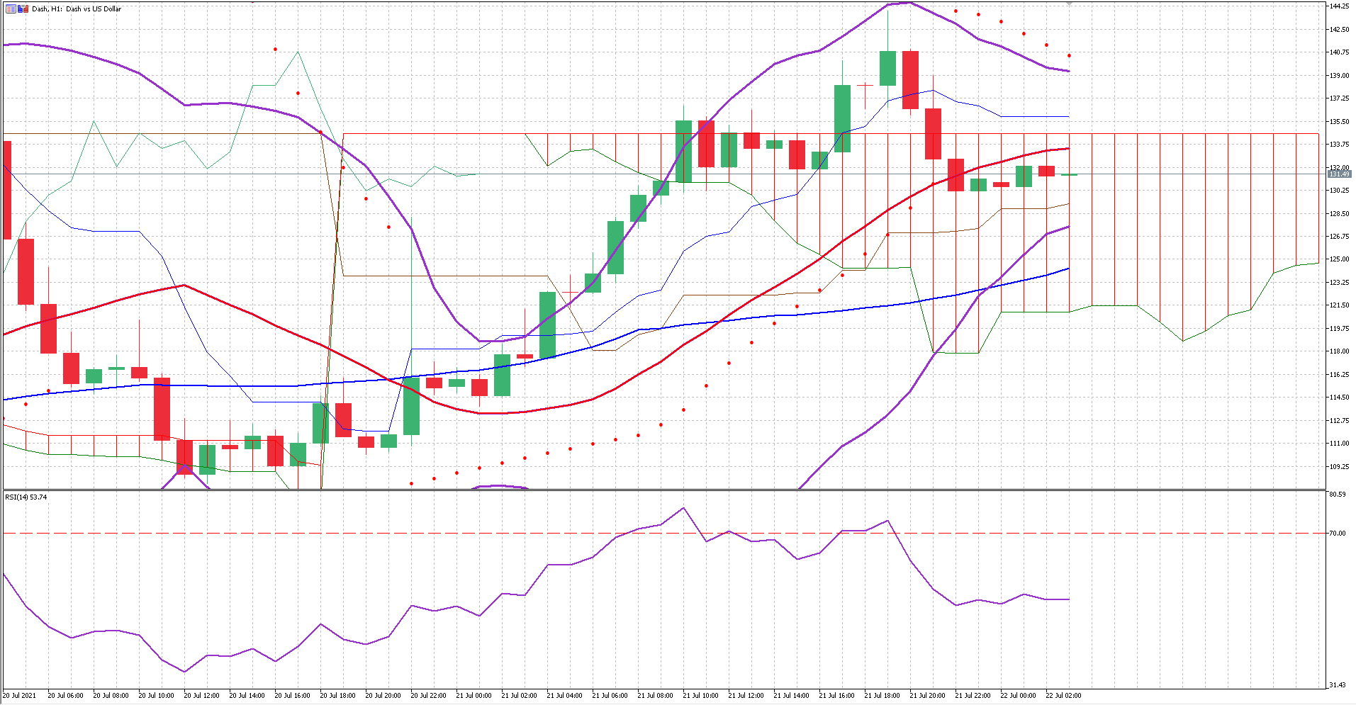 The Bollinger bands are narrow, volatility could be lower in the upcoming trading sessions. The pair traded closer to the upper band, suggesting that the price could reach a relatively high price in the next few days, but as the bands are closing, we expect a breakout soon.