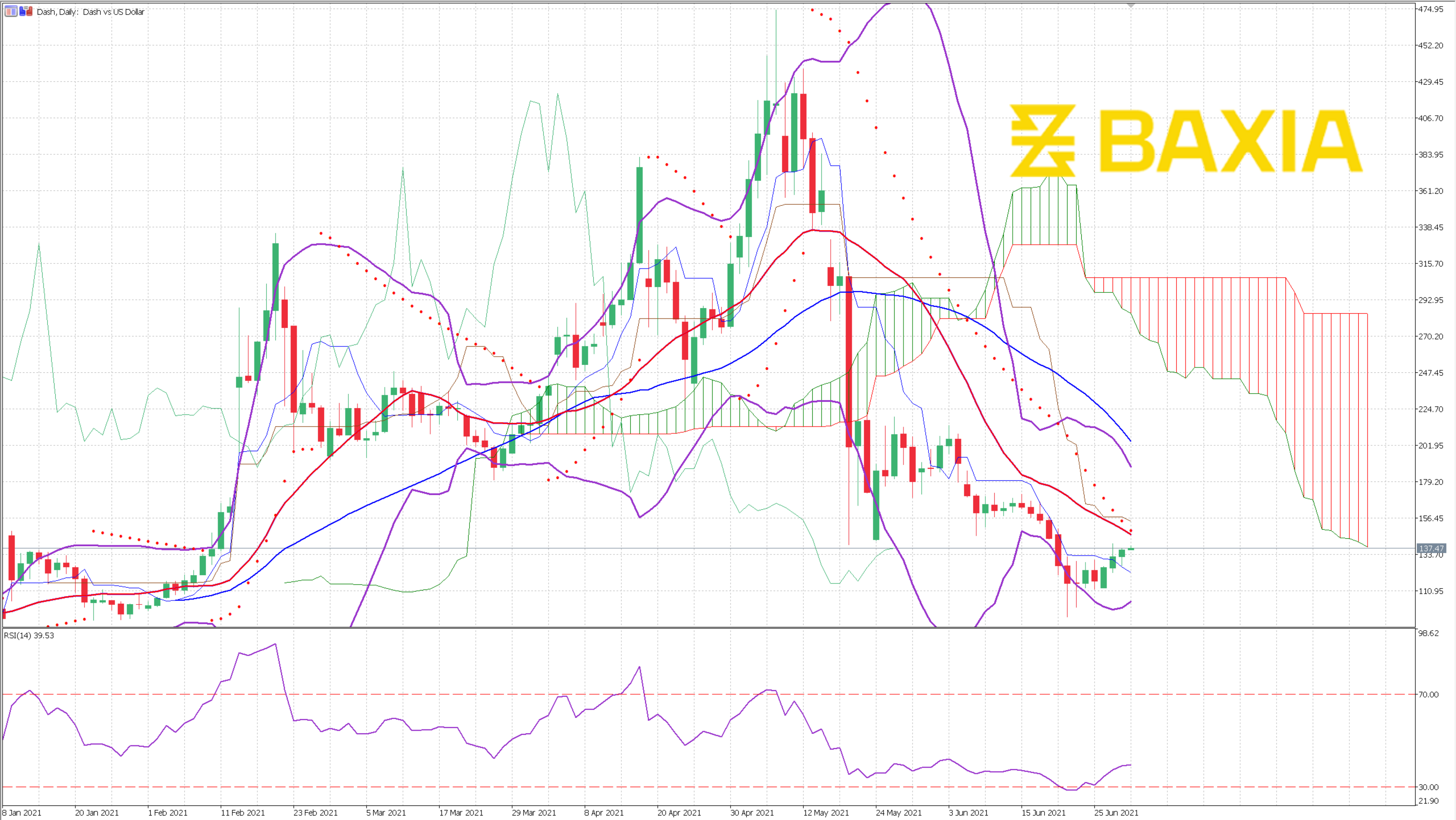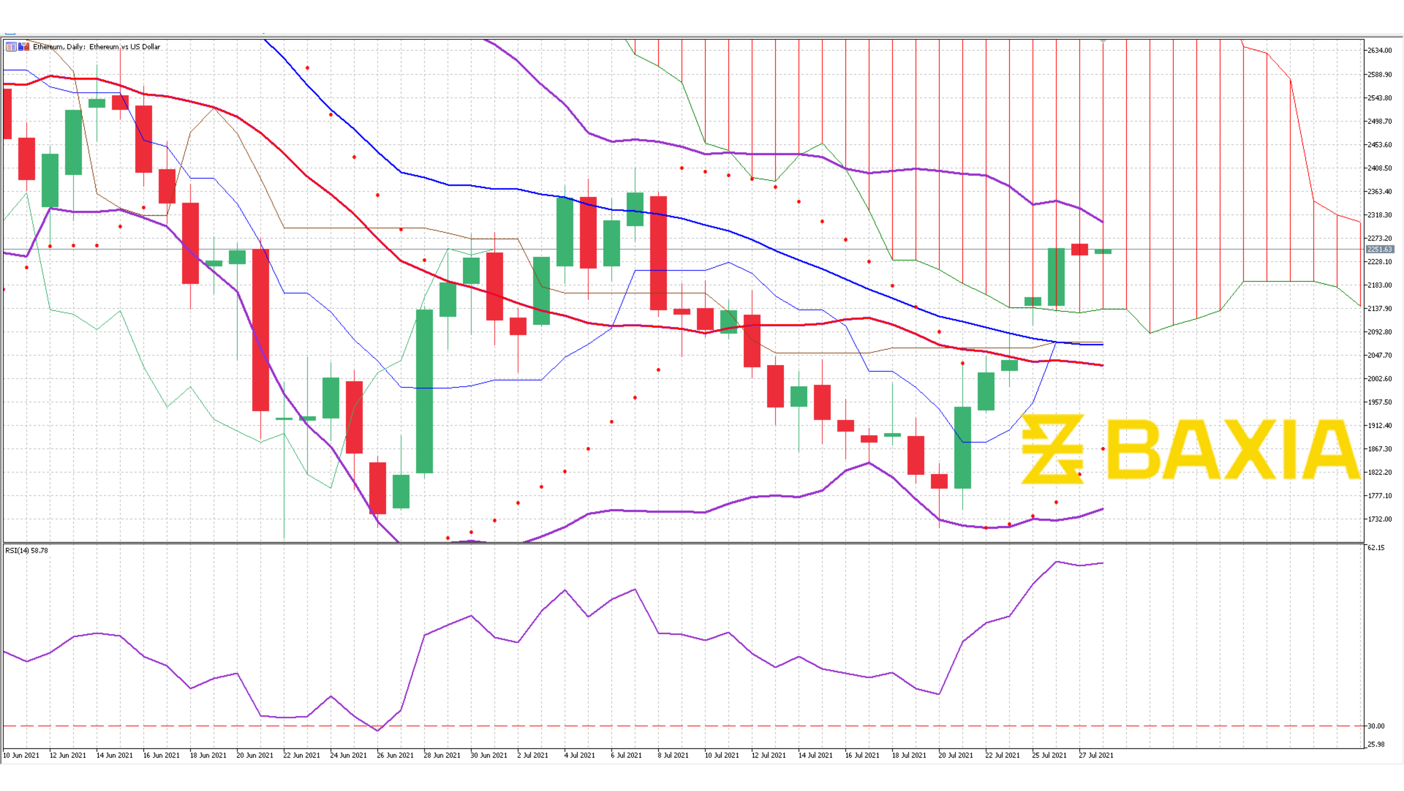 The Bollinger bands are wide, and we should have high volatility. The price is currently trading inside the Ichimoku cloud, suggesting that the markets are uncertain. The relative strength index is at 46%, which would enable the price to move in either direction.