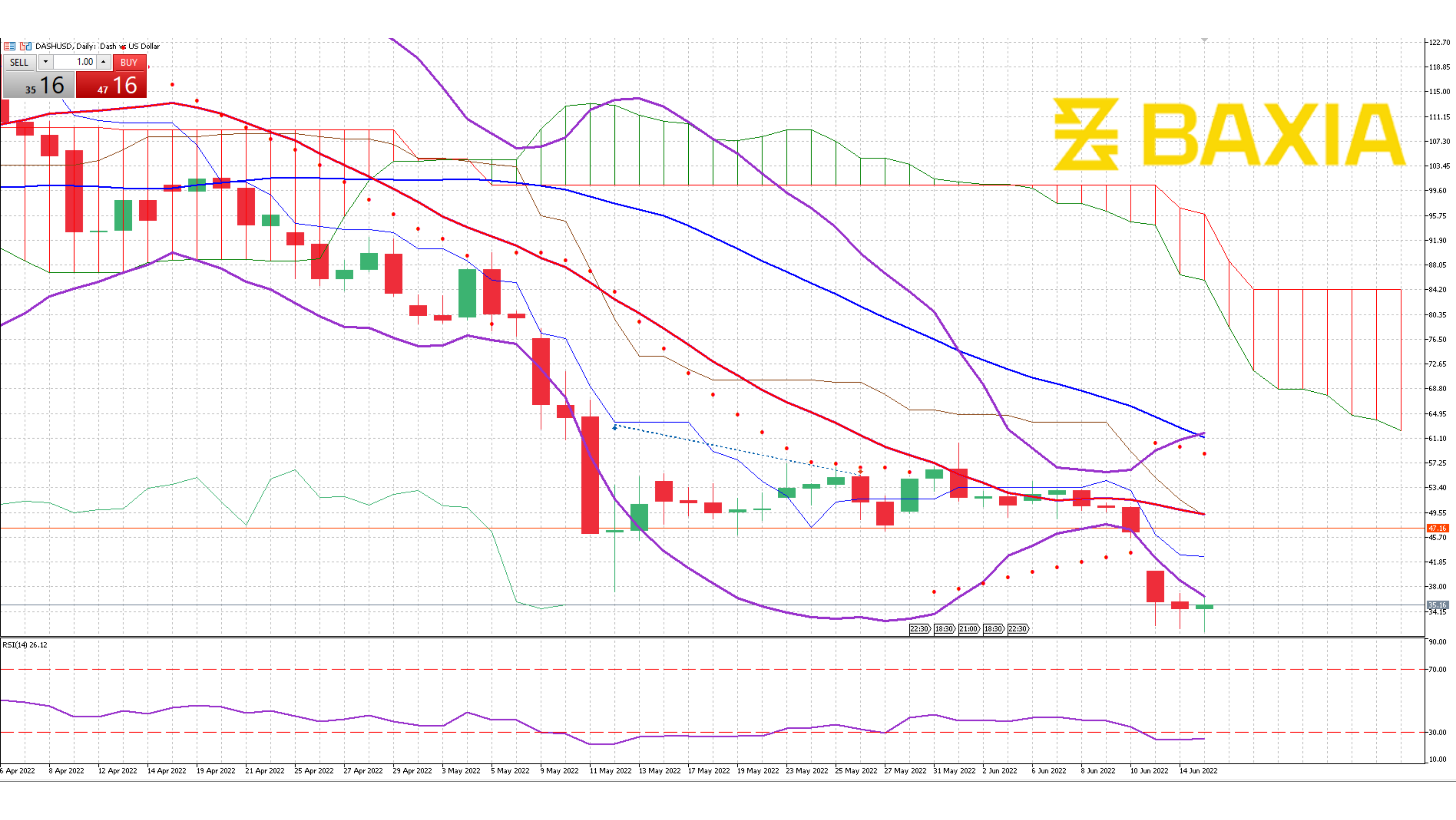 The cryptocurrency continues moving downwards and is down 5.4% in the trading session, the pair started the downtrend on April 5th and has not been able to get a significant recovery. ETH is down almost 20% in 21 sessions.