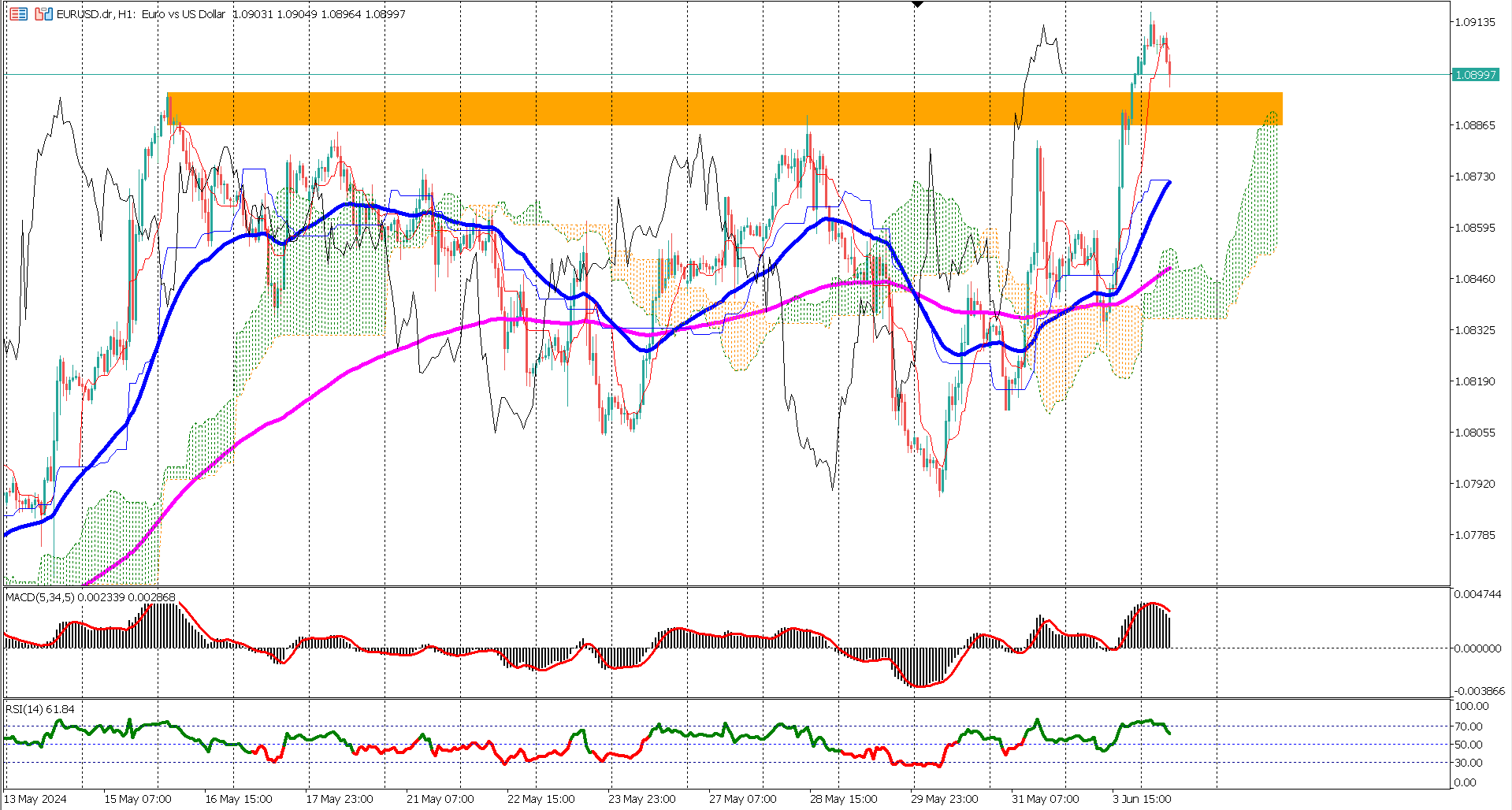 Technical analysis further supports the bearish outlook for EURUSD. A death cross, where the EMA 50 crosses below the EMA 200 on the 1-hour timeframe, has confirmed the bearish reversal. Additionally, the Ichimoku indicator shows the Tenkan-sen, Kijun-sen, and Chikou Span lines positioned below the cloud, indicating a strong bearish sentiment.