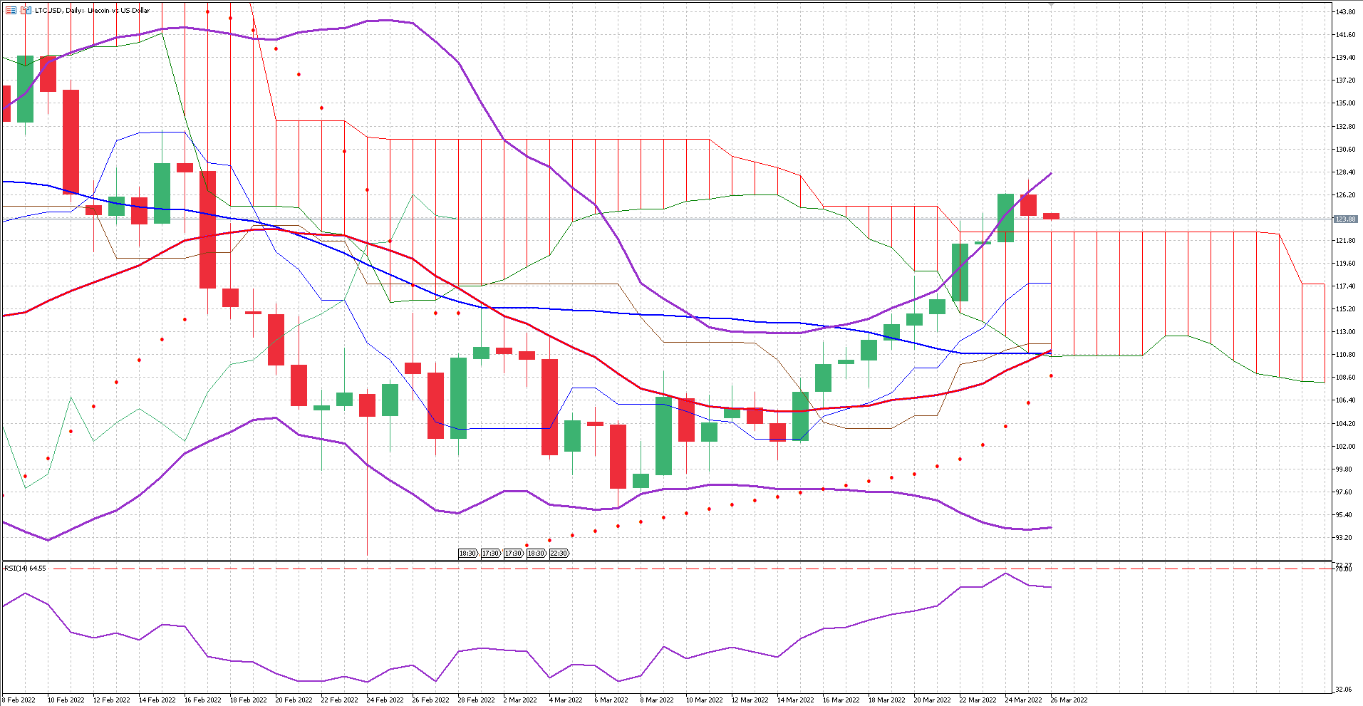 The relative strength index is at 57% which will also allow the price to continue climbing until it reaches an overbought status at 70%. Litecoin is entering the Ichimoku cloud which could bring market uncertainty. Our parabolic SAR indicator suggests that the price will continue the uptrend.