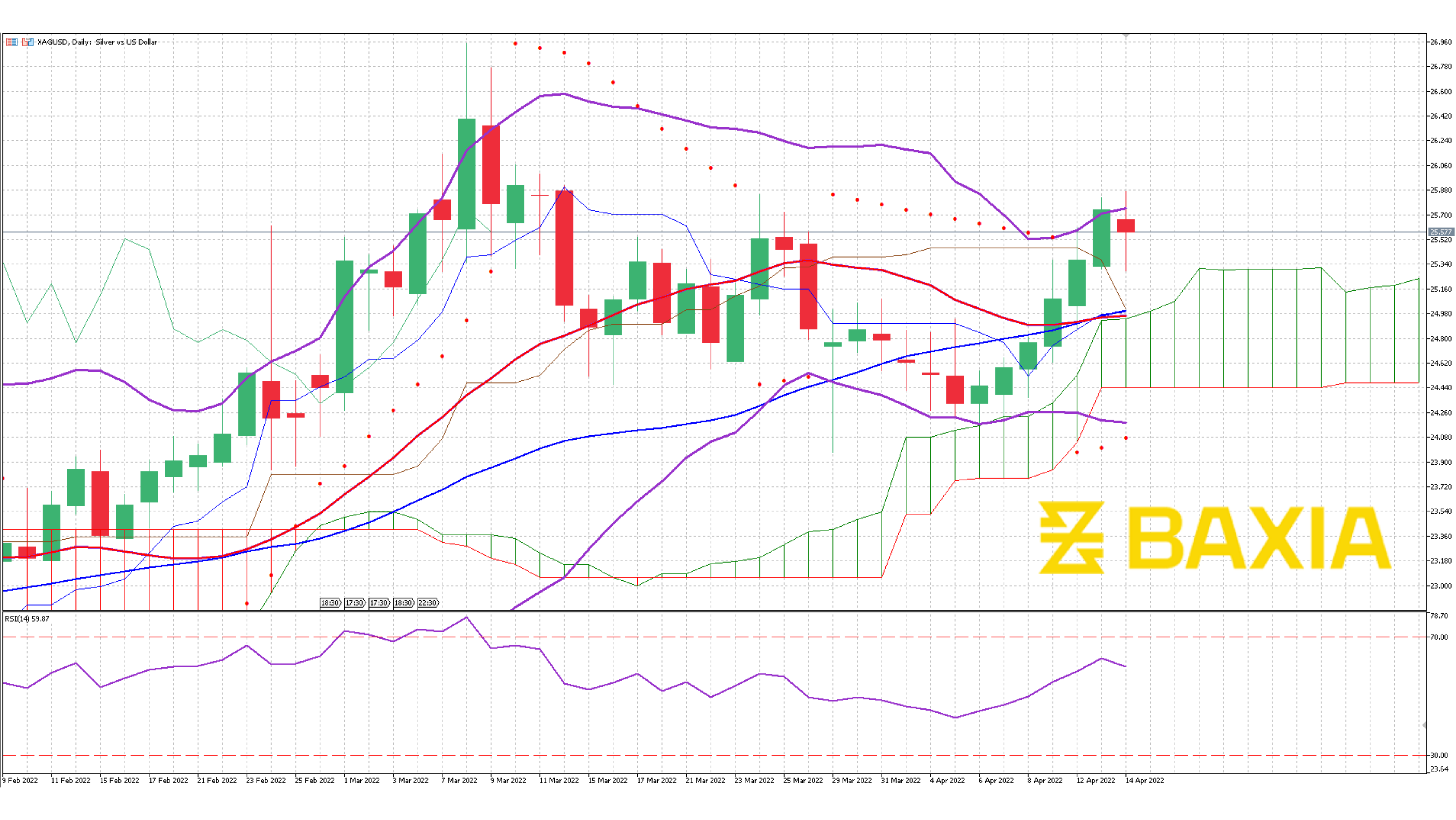The price is entering the Ichimoku cloud, which often indicates market uncertainty; however, the cloud is signaling an uptrend, which should be positive for Silver.