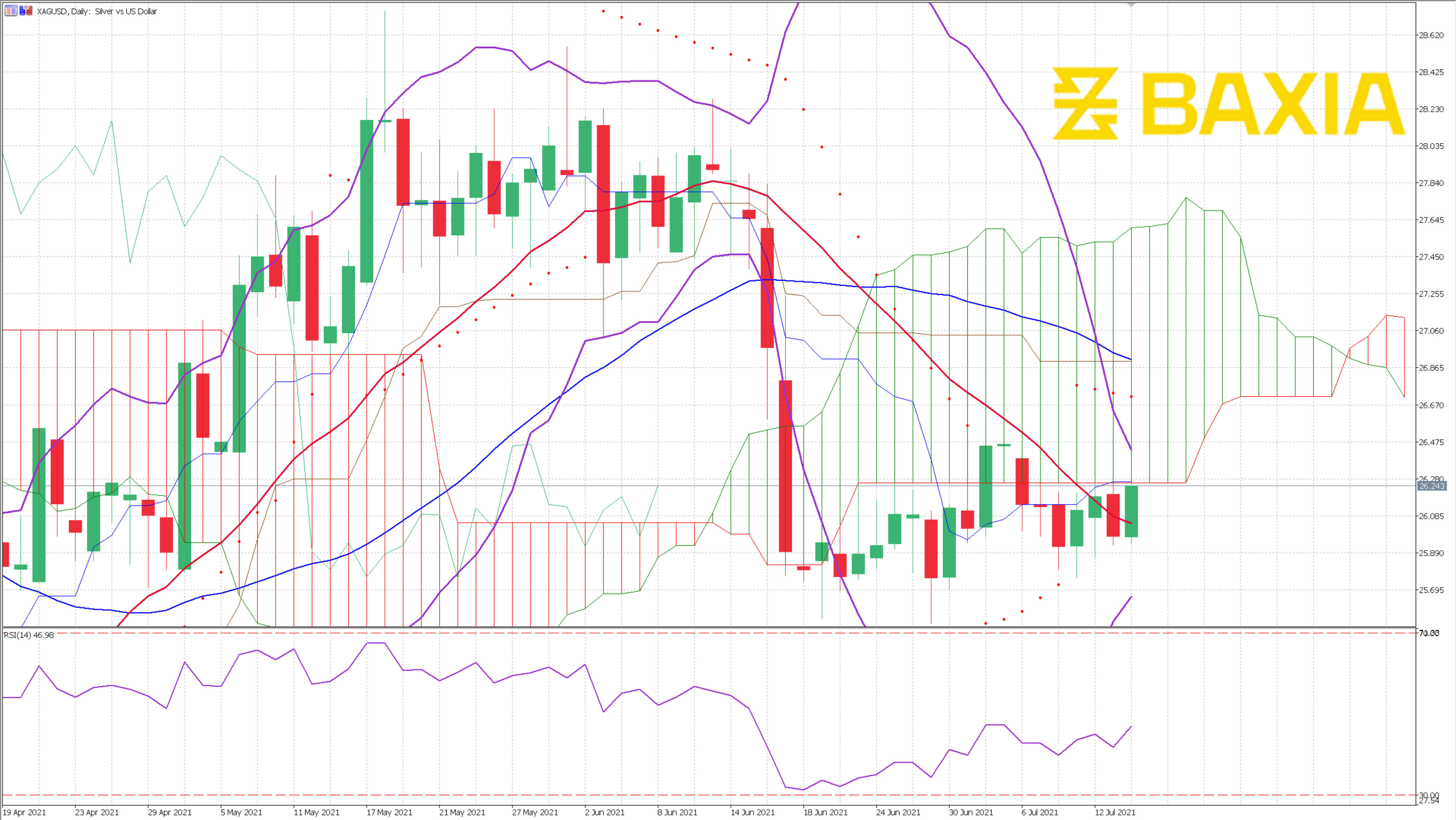 XAGUSD has been moving sideways for ten trading sessions now. The price broke the 50% Fibonacci retracement almost two weeks ago; this often indicates a change in the trend; however, the price seems to be consolidating close to the $26.05 price line.