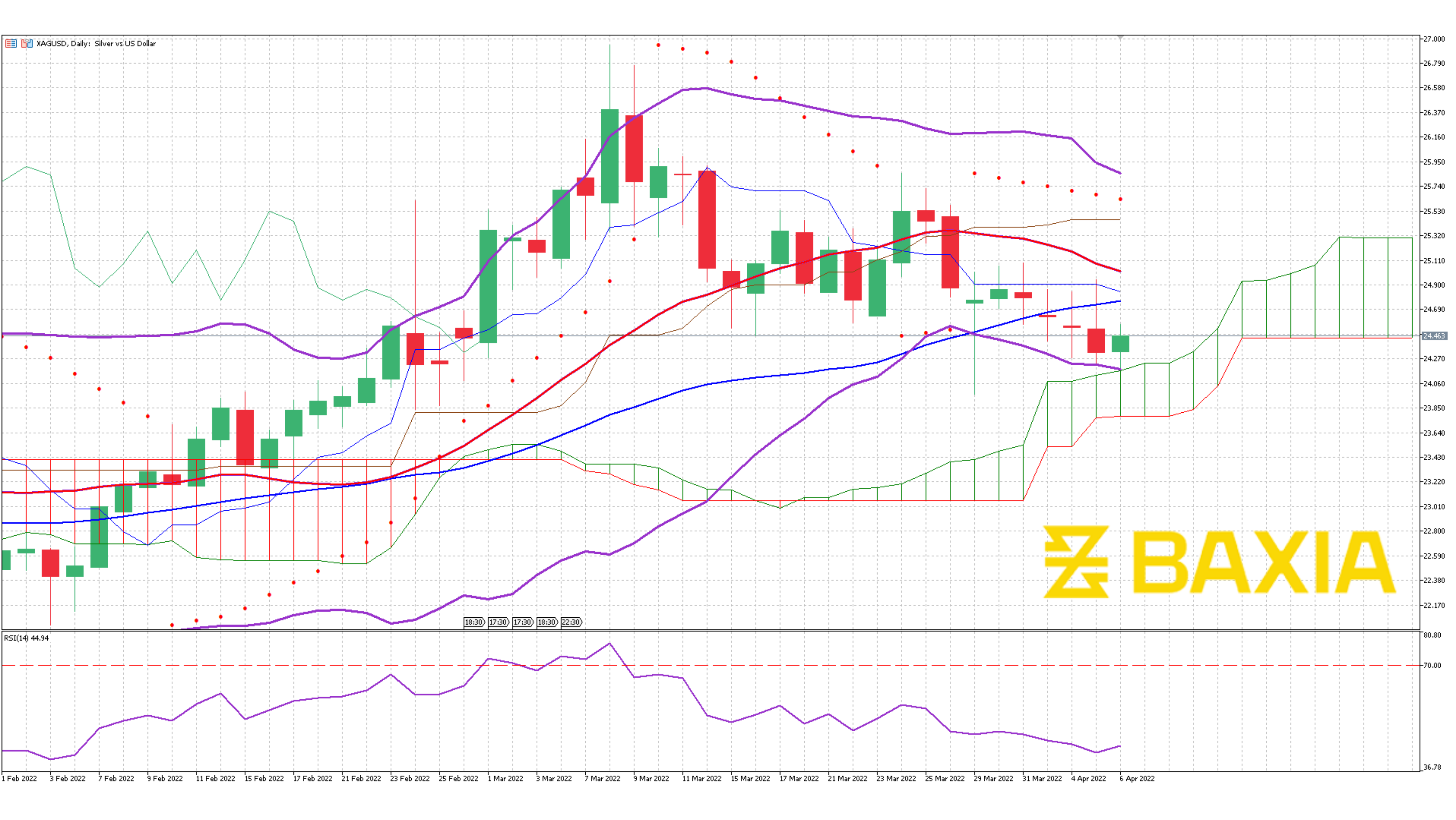 The relative strength index is at 33% which is very close to entering the oversold status, a recovery is expected from a technical analysis perspective. This RSI level will allow Silver to freely climb and potentially break the resistance. Our parabolic SAR indicator suggests that the price will continue to fall in the short term.