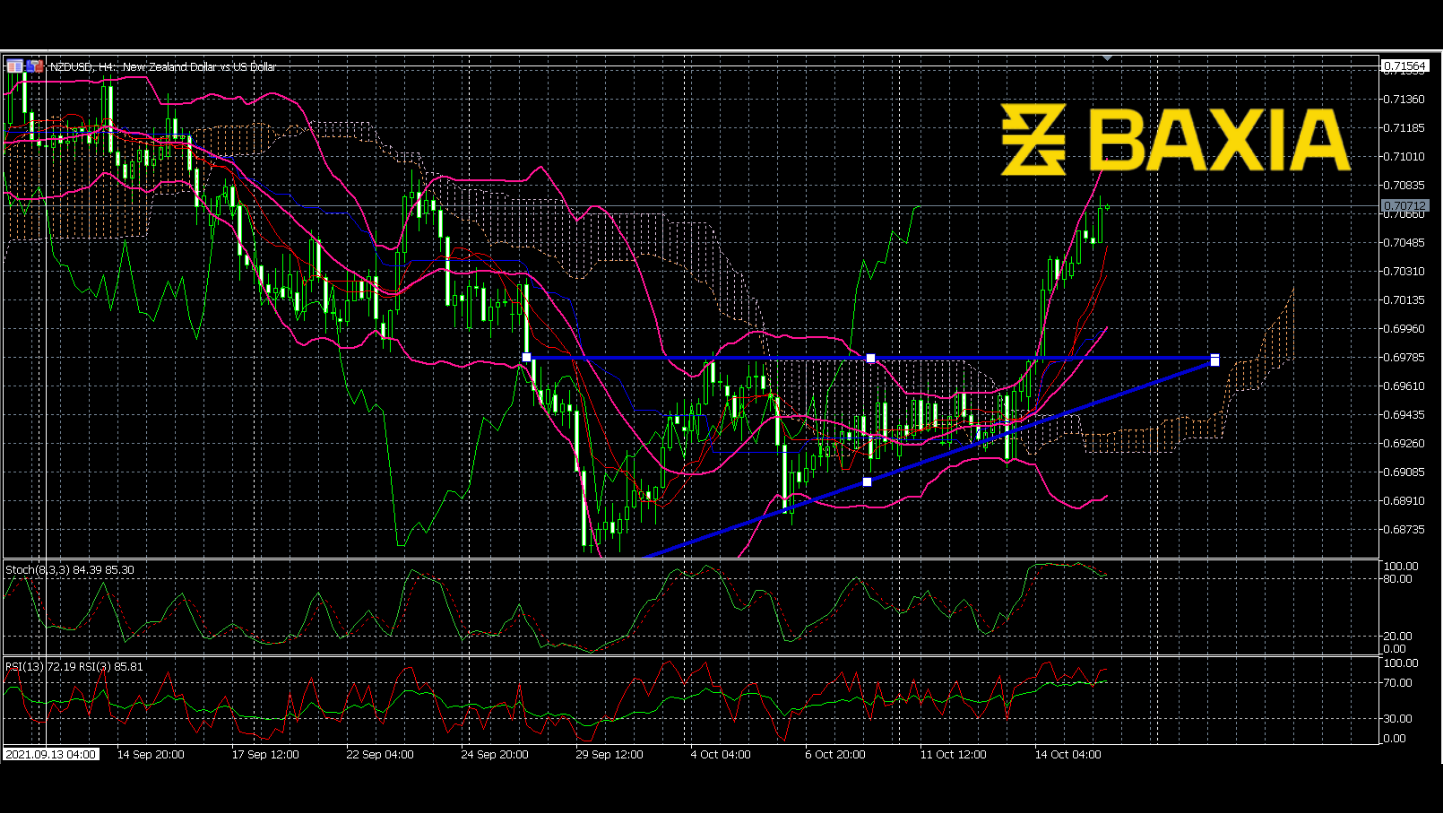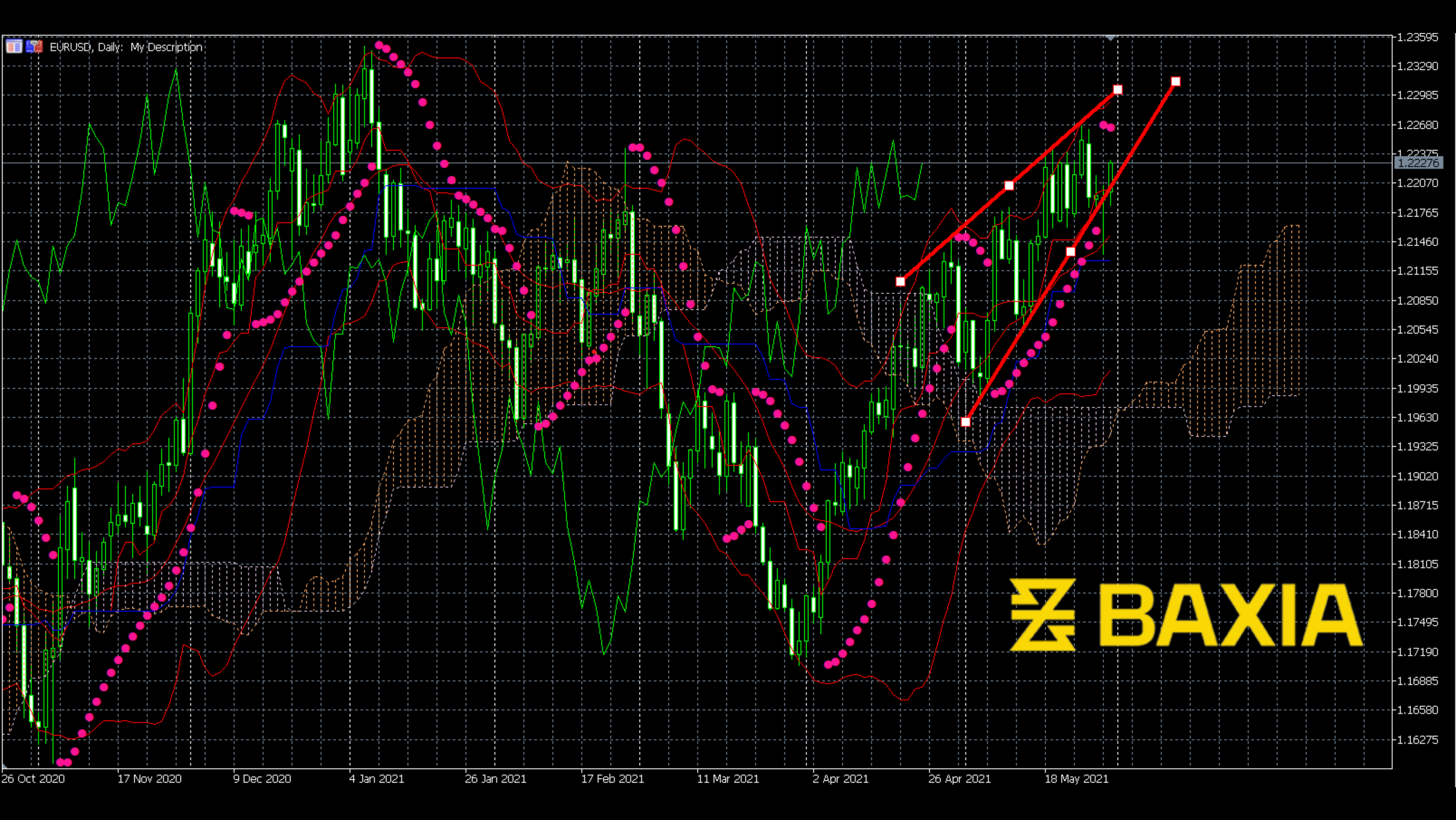 Actually, either a pennant or a rising triangle shows the same result here for this situation. As we know, the pennant is a breakout signal; the breakout direction depends on the previous trend. Before the pennant, the price was going up in a steeper slope, which means if the pattern is a pennant, the breakout direction of this pennant would be upward. On the other hand, if the pattern is a rising triangle, the price would also break up. Now, the price line twists with the Ichimoku cloud, Bollinger Bands shrinks, which are also breakout signals.