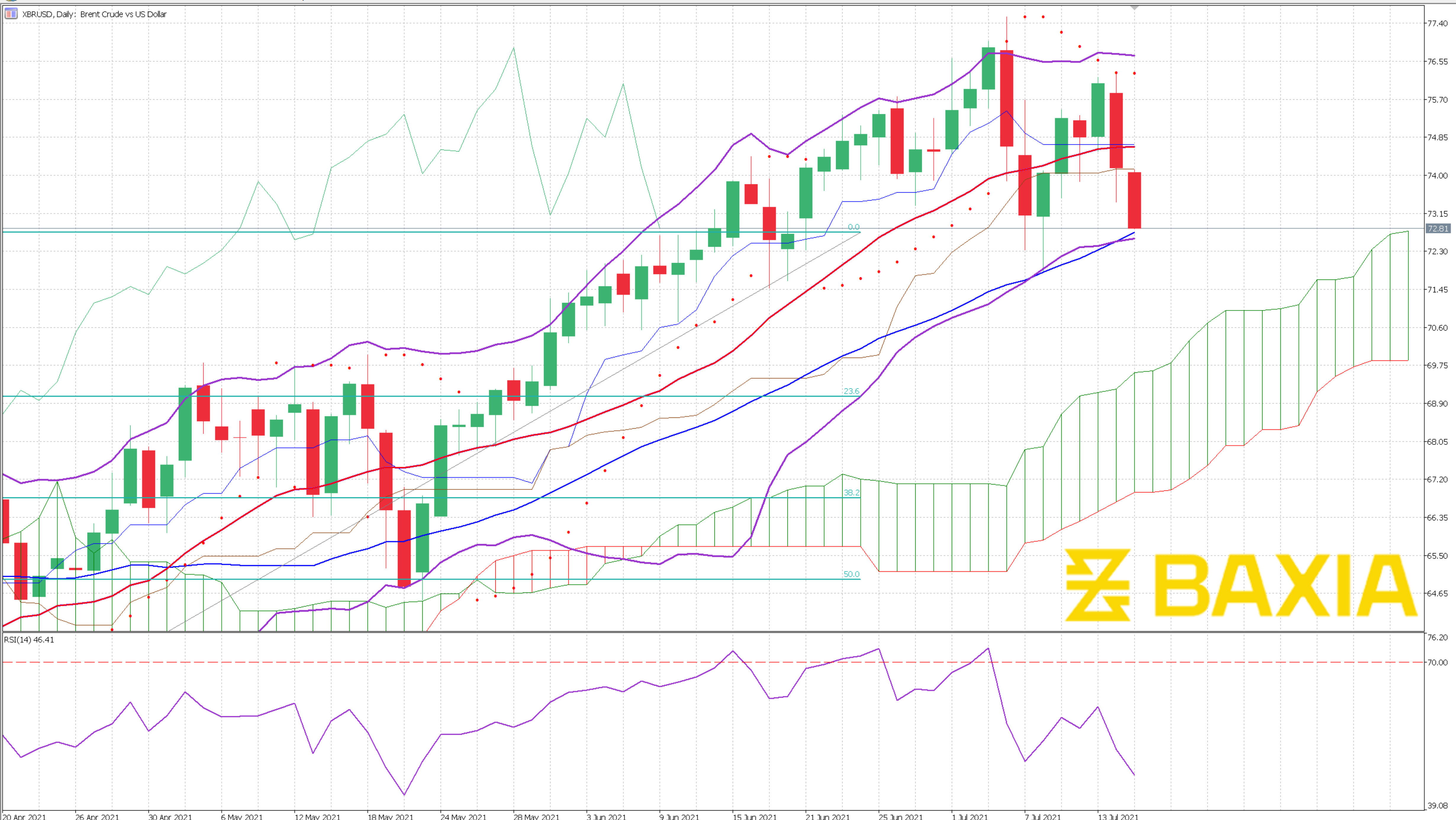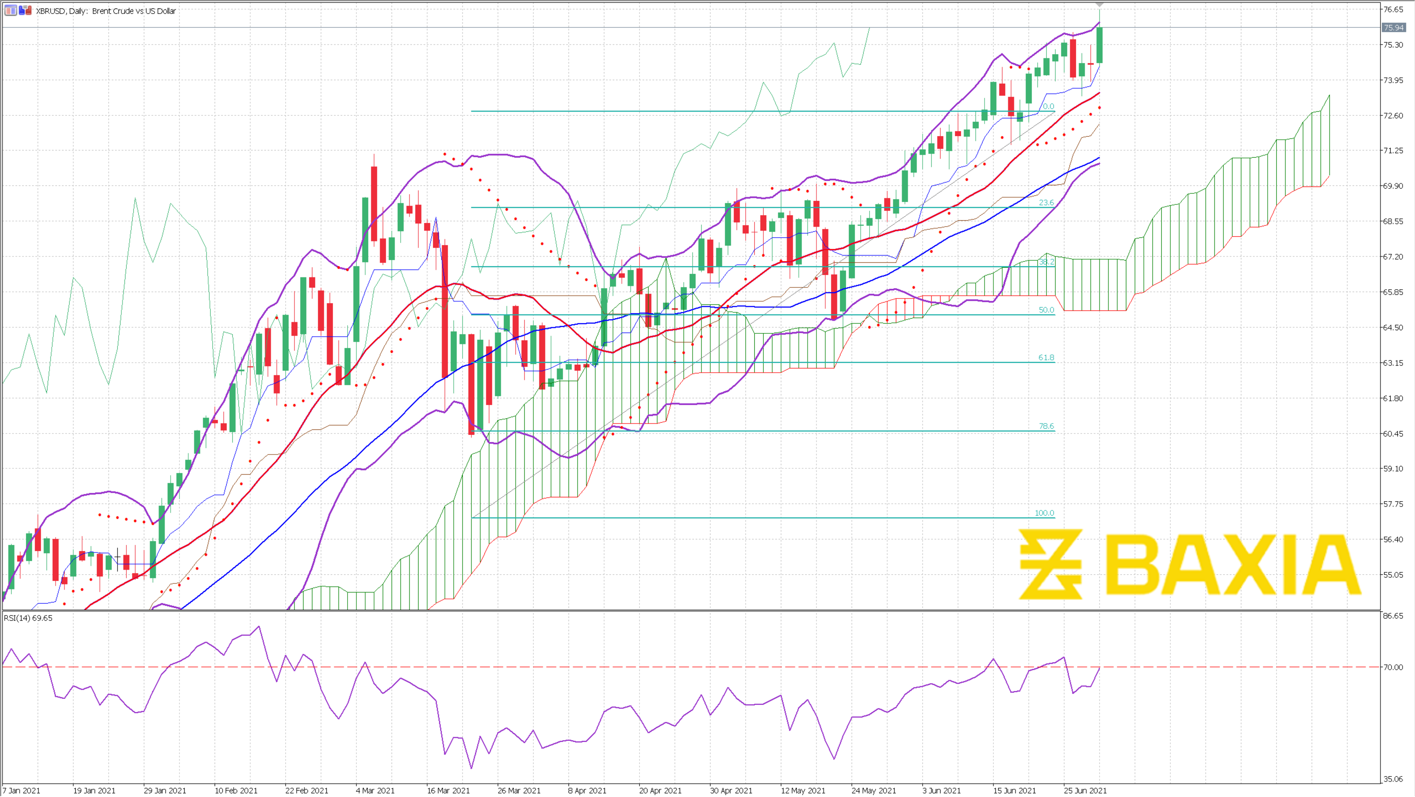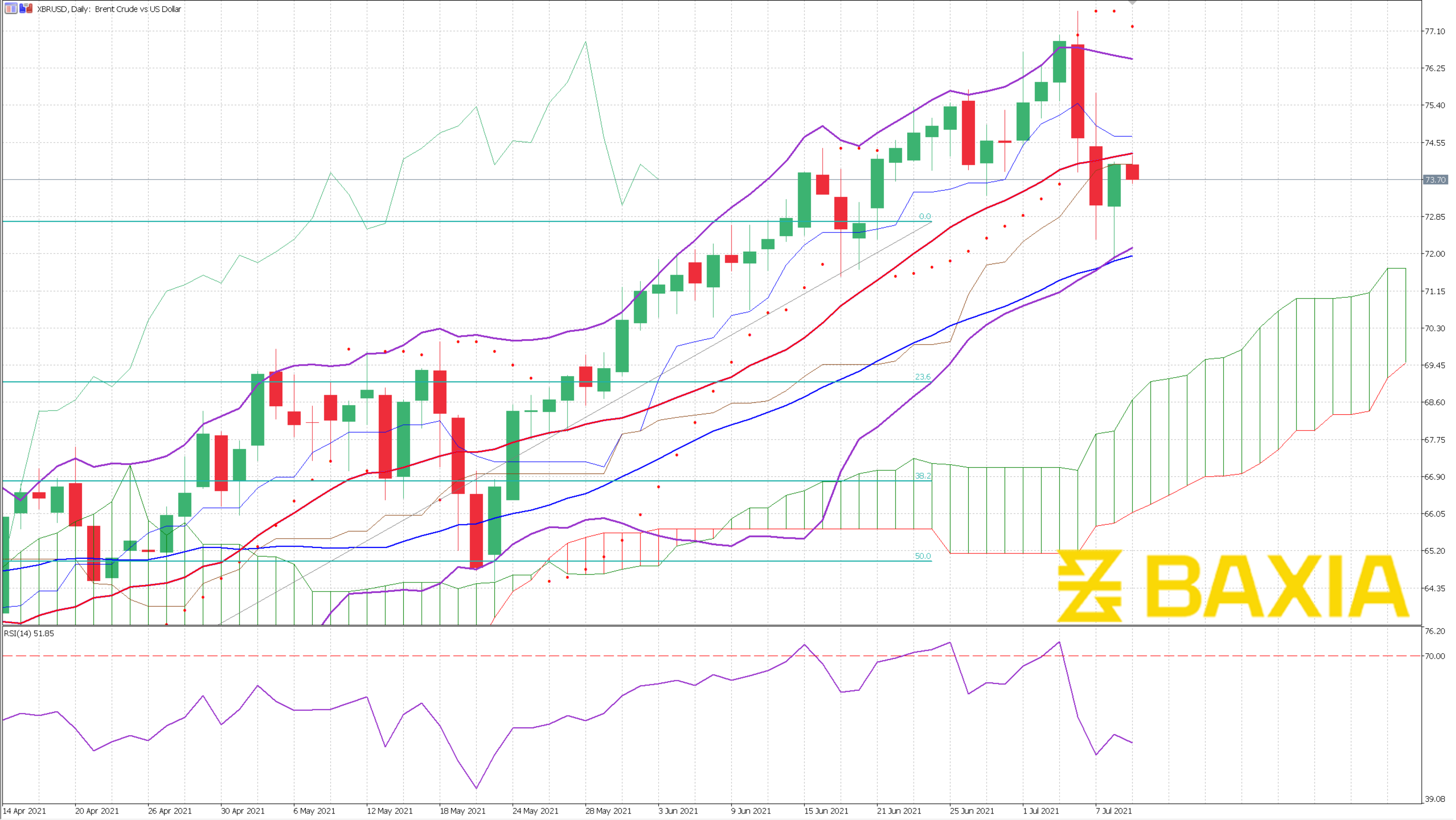 US Oil reached $73.94 and came just short of breaking that resistance at $74; this resistance might be tough to break right away as the relative strength index is overbought.